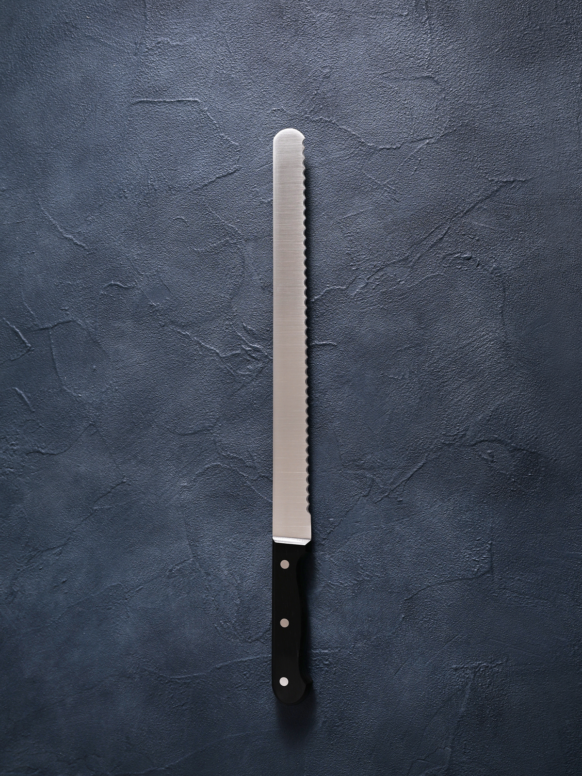 A bread knife has a serrated blade and is suitable for slicing soft foods such as bread and cake.