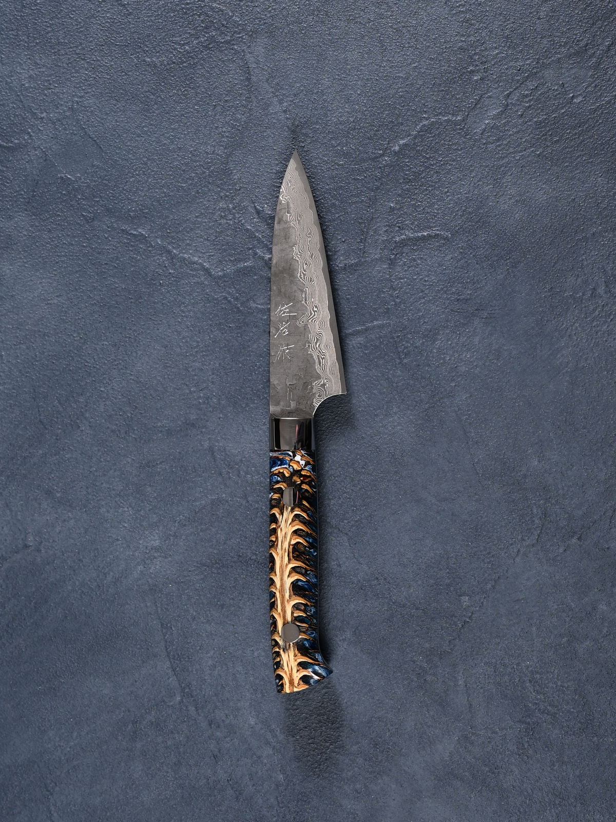 Takeshi Saji Petty Knife, 90mm, VG10 Steel, Cross-Hammered Black Finish, Pine Cone Handle
