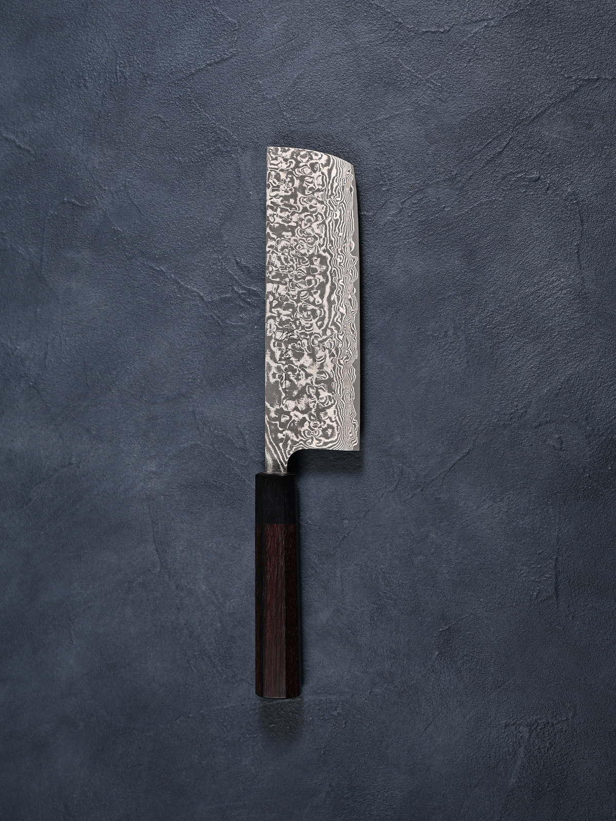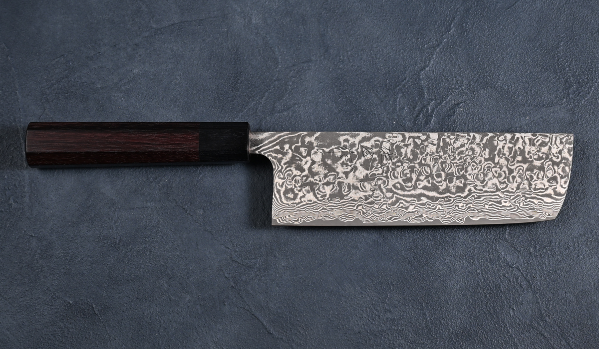 Takeshi Saji Nakiri Knife, SG2 Powdered High-Speed ​​Steel, Damascus Black Finish, Rosewood Octagonal Handle