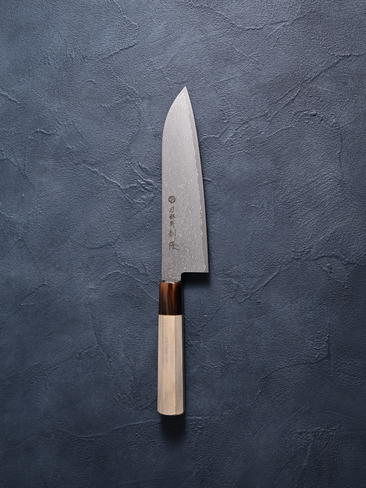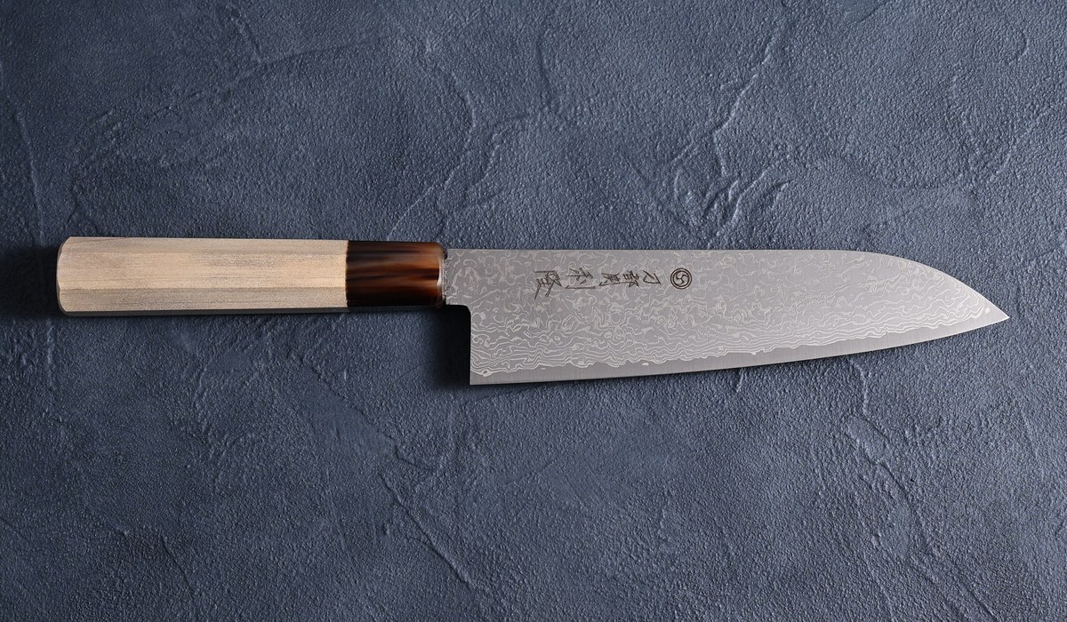 Toshitaka Santoku knife, SG2 powdered high-speed steel, Damascus, buffalo-horned octagonal handle
