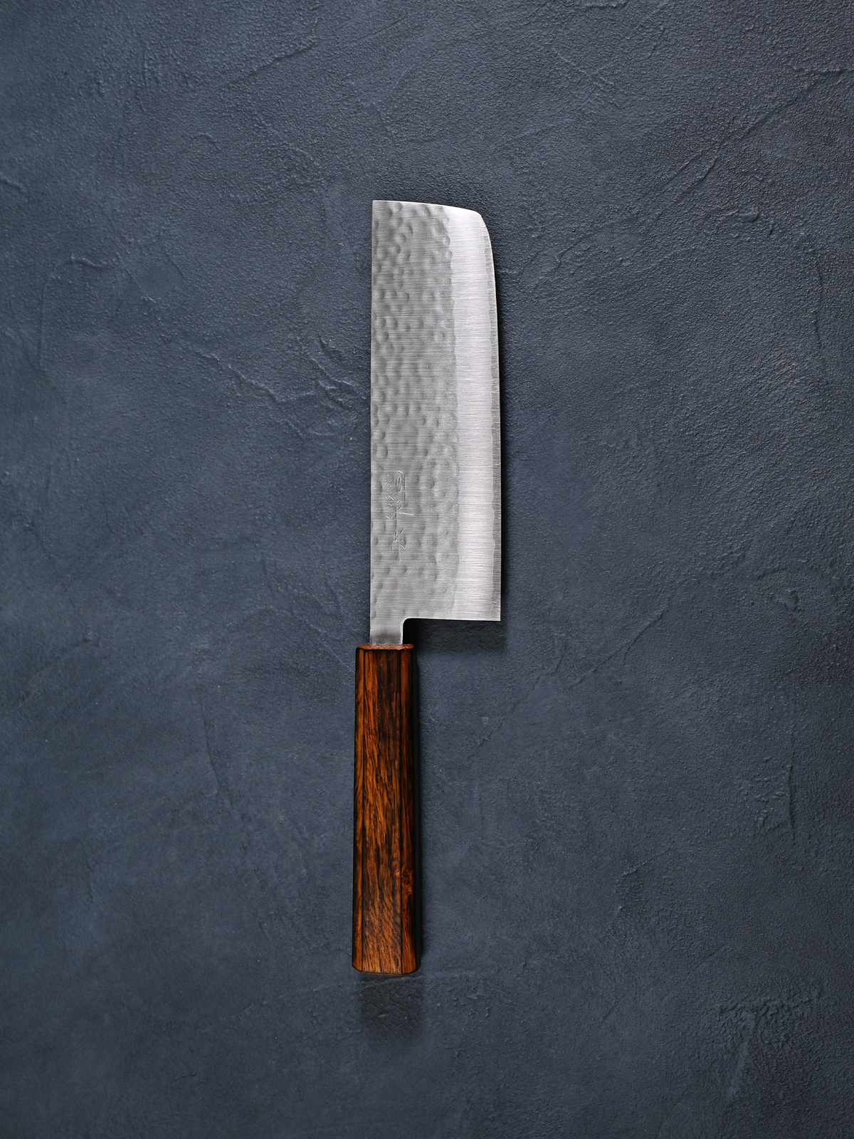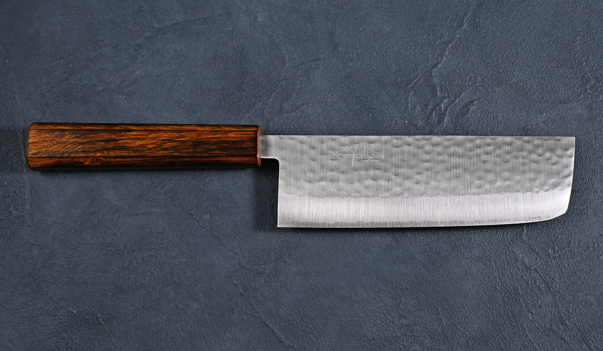 Masutanihamono Nakiri Knife, VG1 Steel, Hammered Edge, Black Oak Smoke with an Octagonal Handle