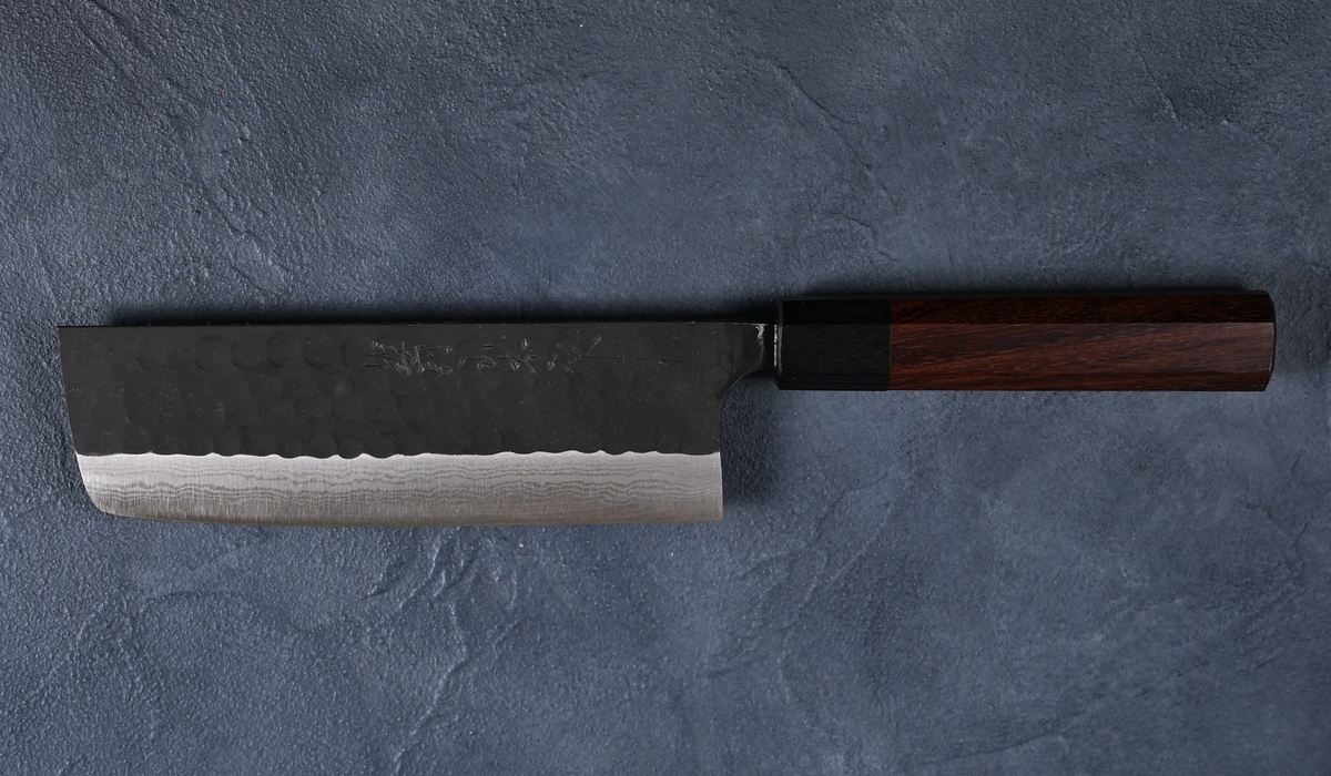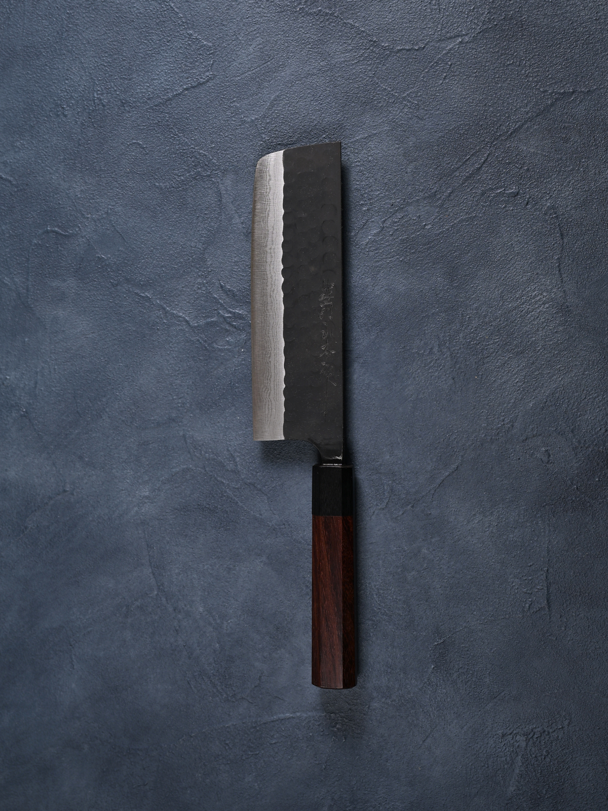 Nao Yamamoto Nakiri Knife, Blue Paper Super Steel, Black Hammered, Rosewood Octagonal Handle