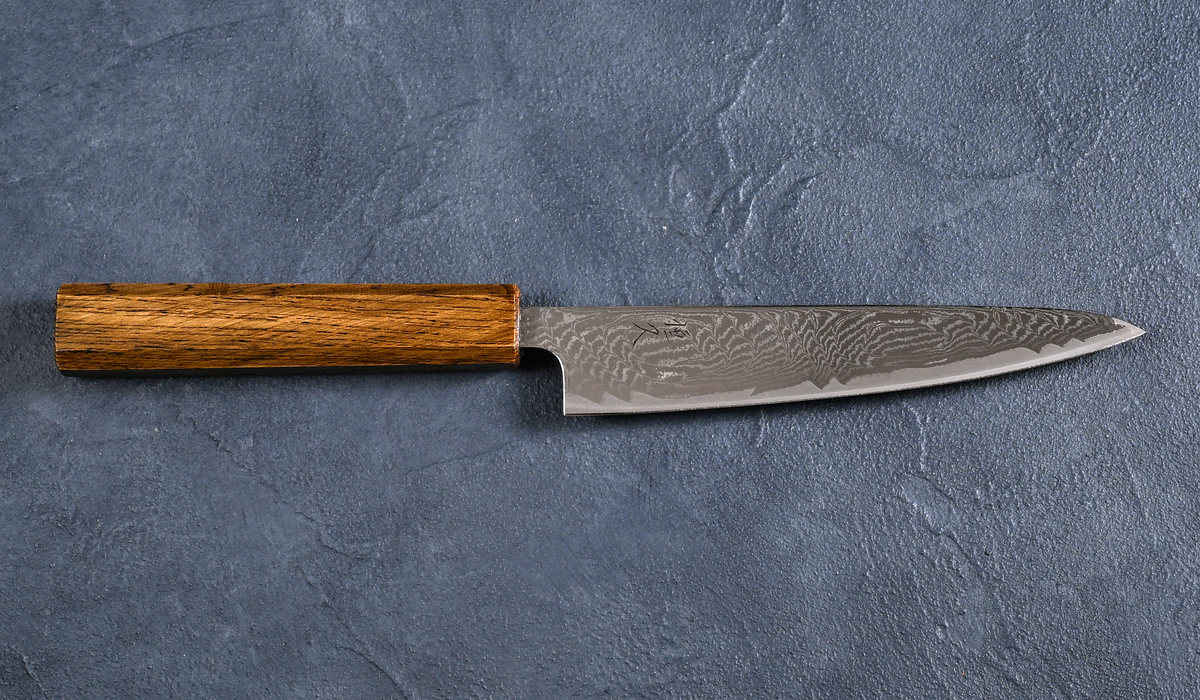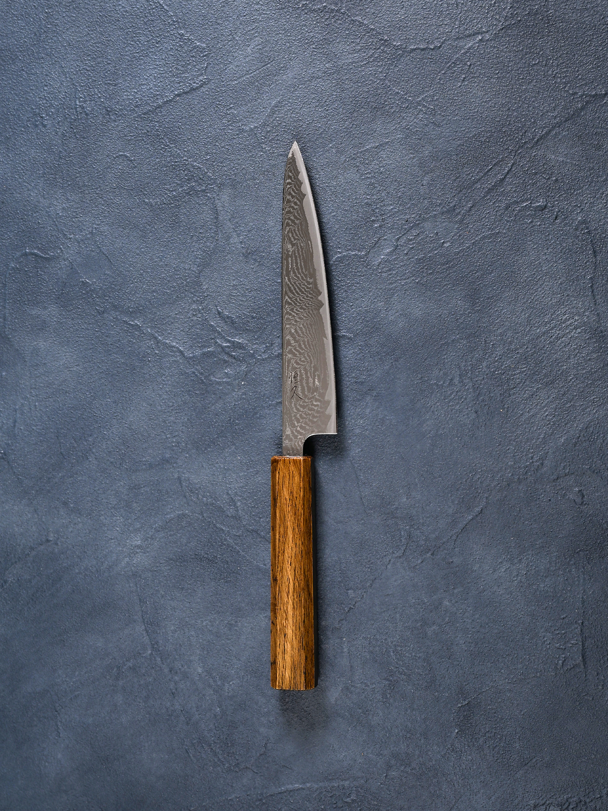 Tsunehisa Petty Knife 150mm AUS10 Steel Damascus Wave Oak Smoke Black Octagonal Handle