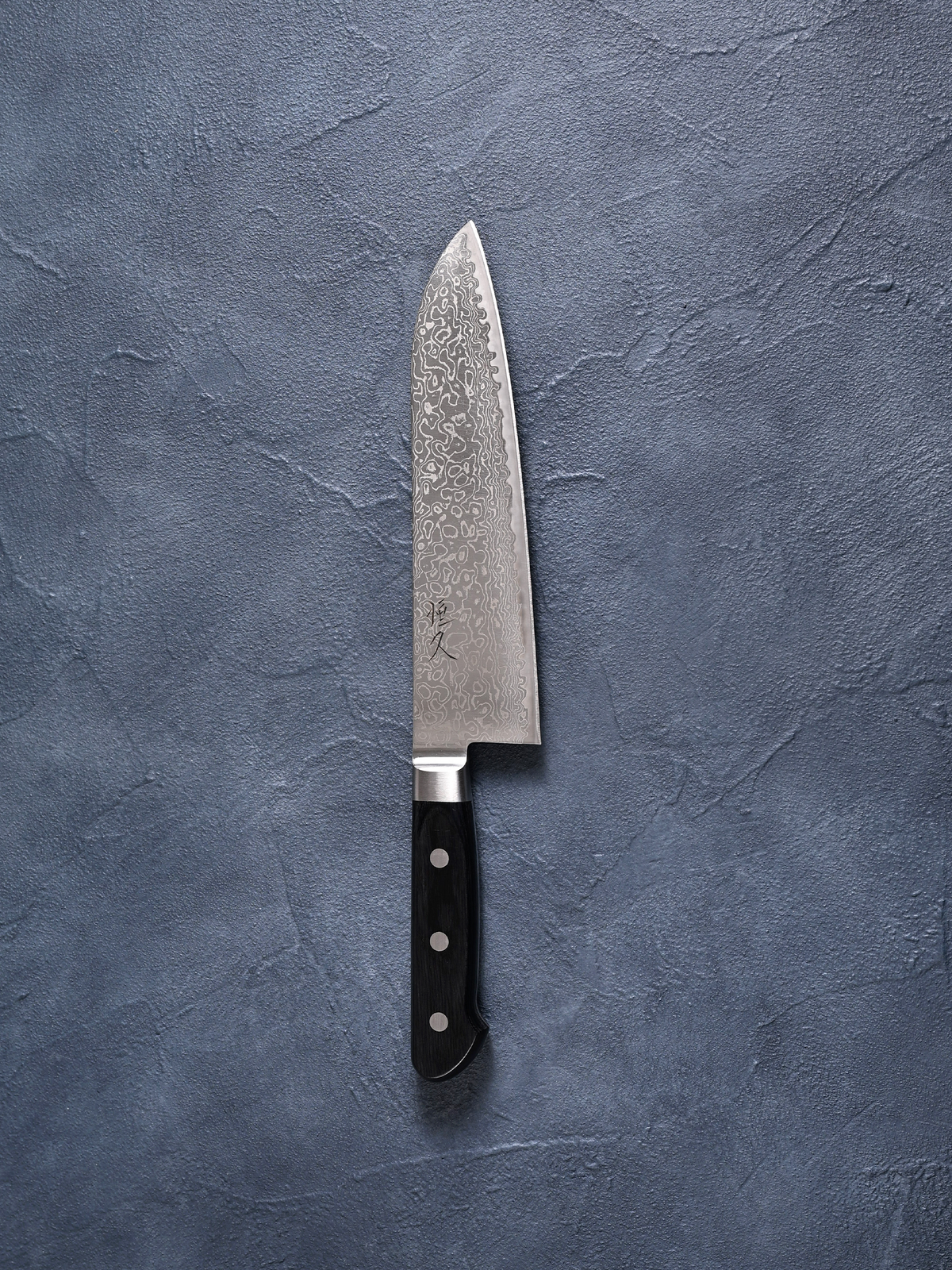 Tsunehisa Santoku Knife, AUS10 Steel, Damascus, Black Western Handle