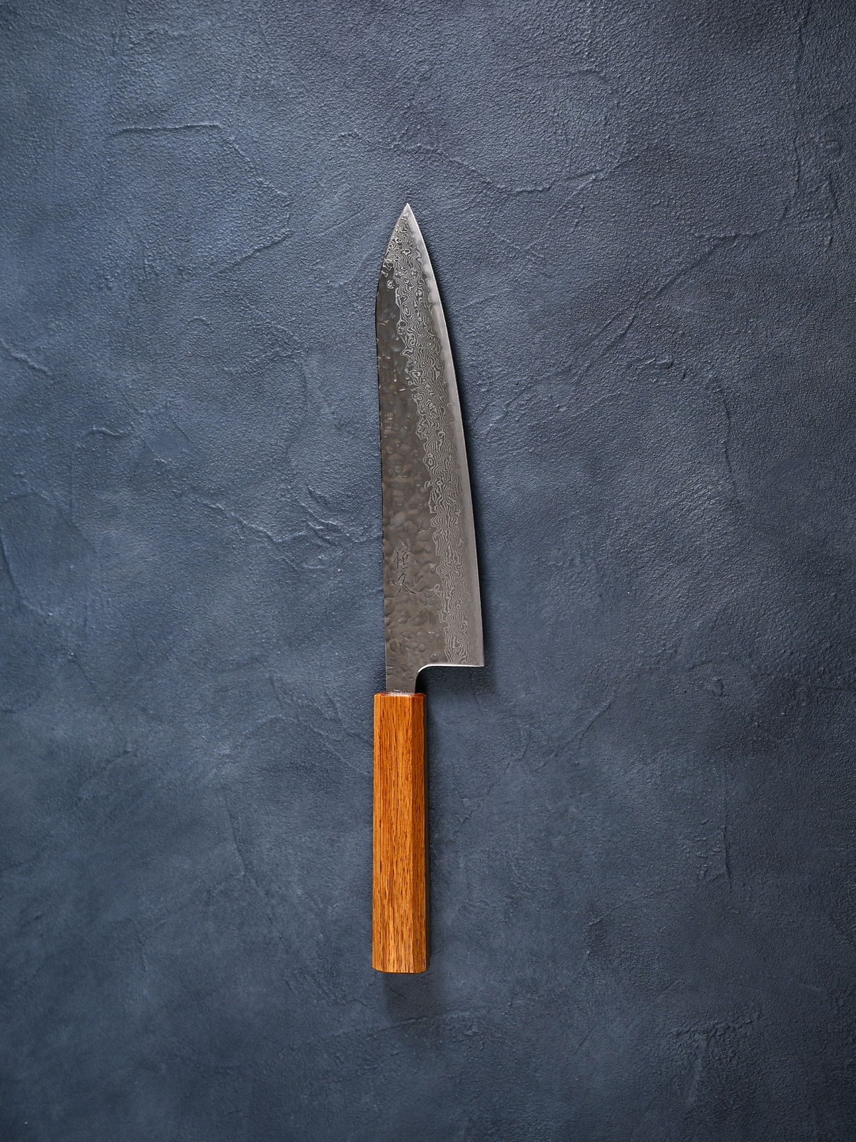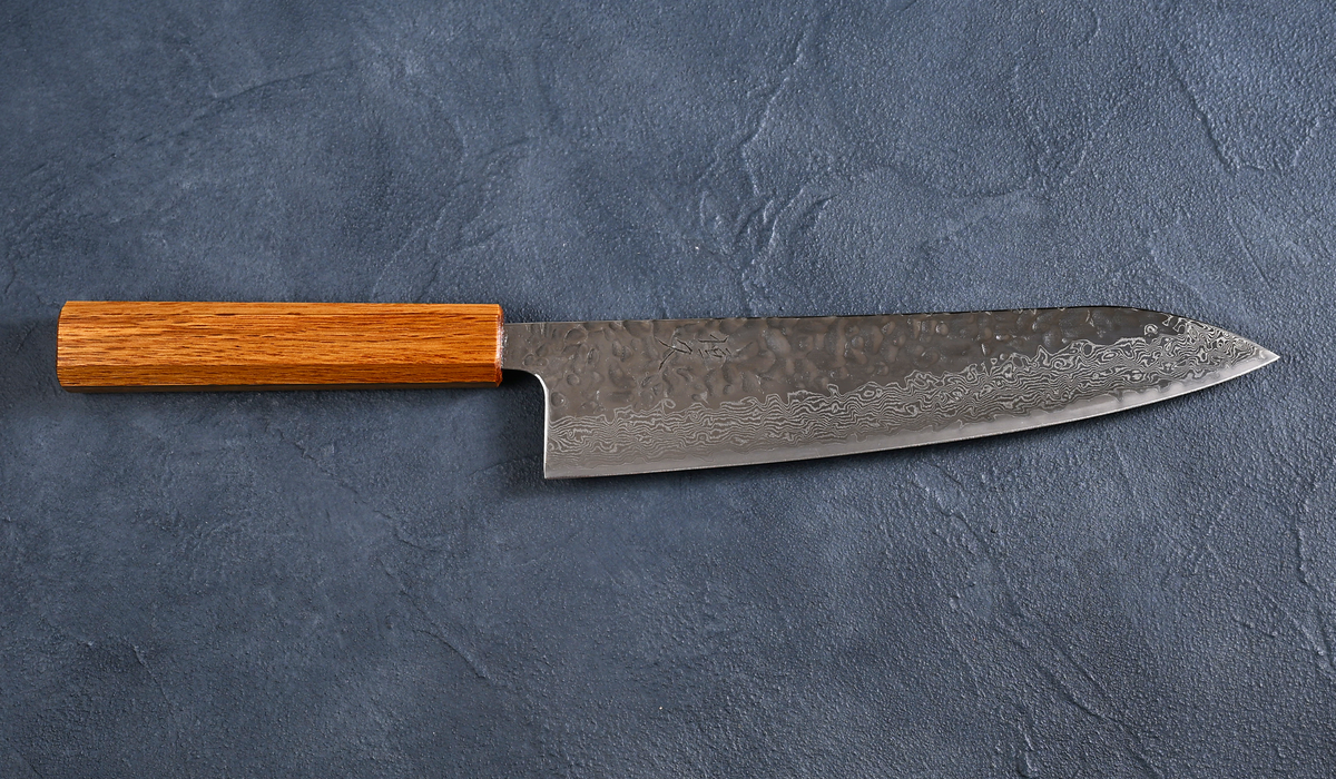 Tsunehisa Gyuto Knife, 210mm, AUS10 Steel, Damascus Steel with Hammered Edges and an Octagonal Oak Handle