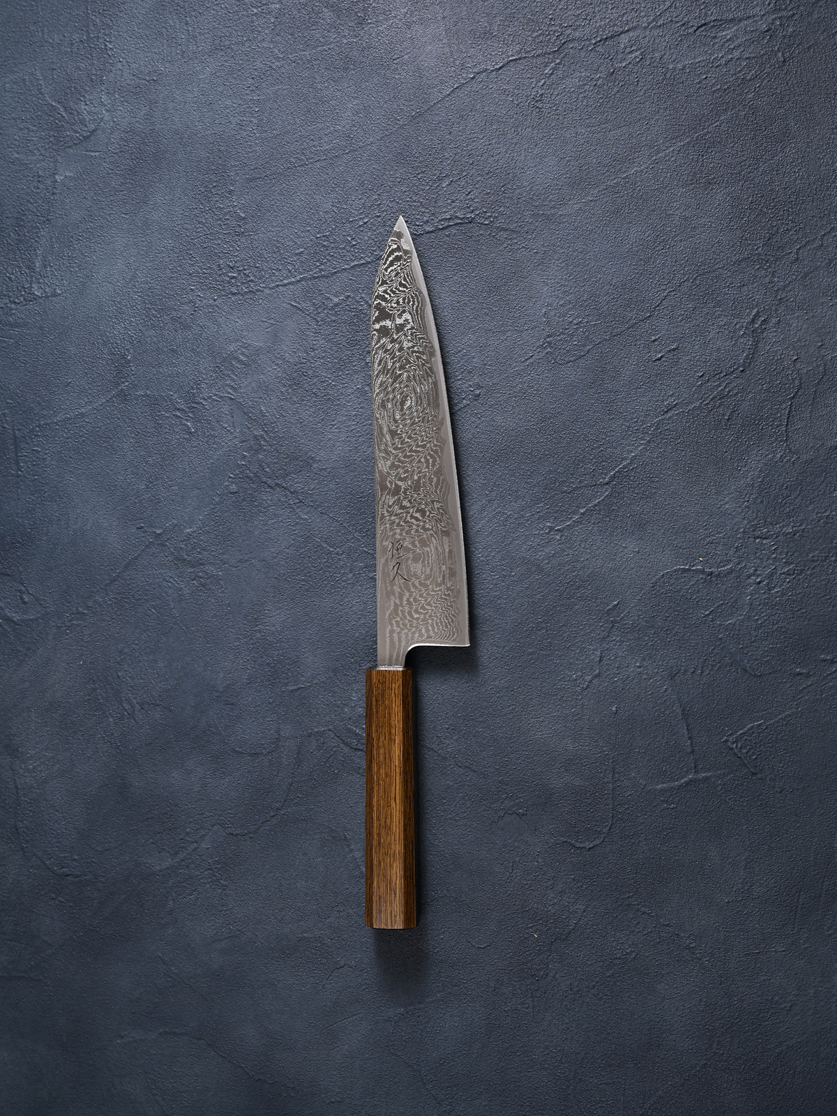 Tsunehisa Gyuto Knife, 210mm, AUS10 Steel, Damascus Steel, Wave Pattern, Oak Smoke Black Octagonal Handle