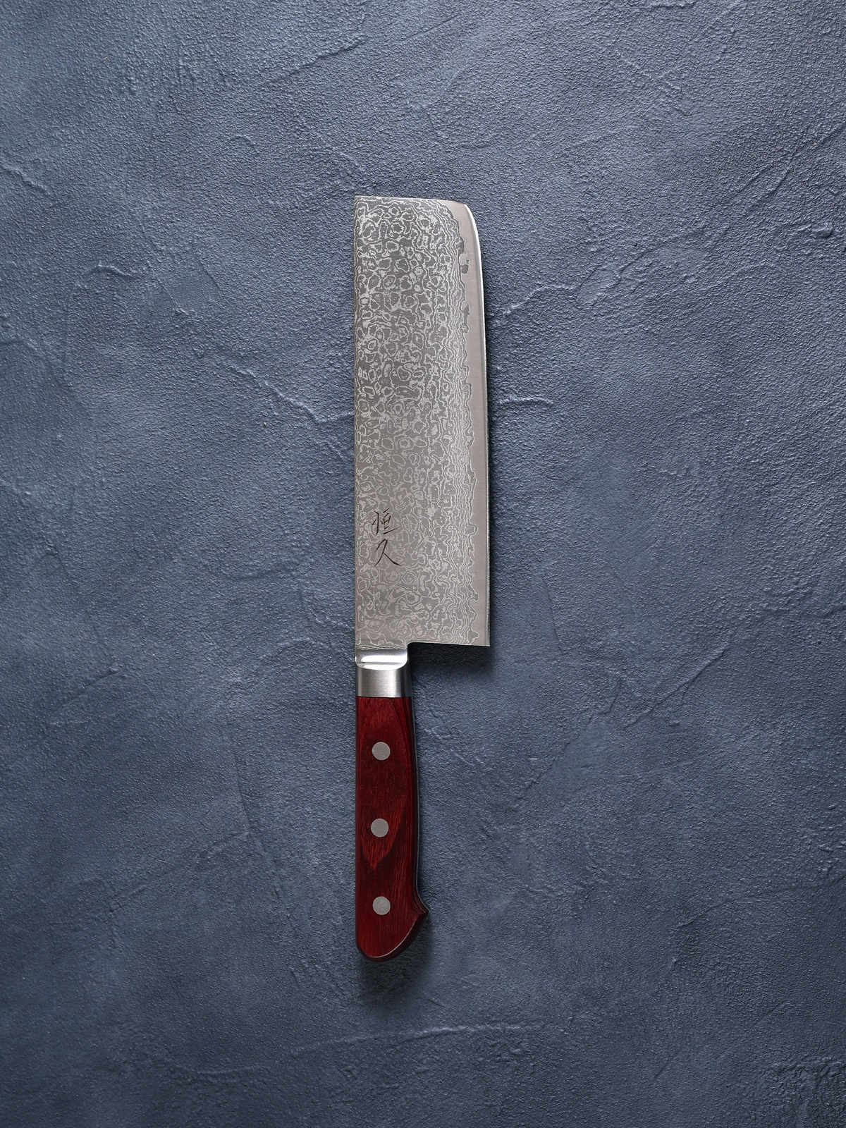 Tsunehisa Nakiri Knife AUS10 Steel Damascus Red Western Handle