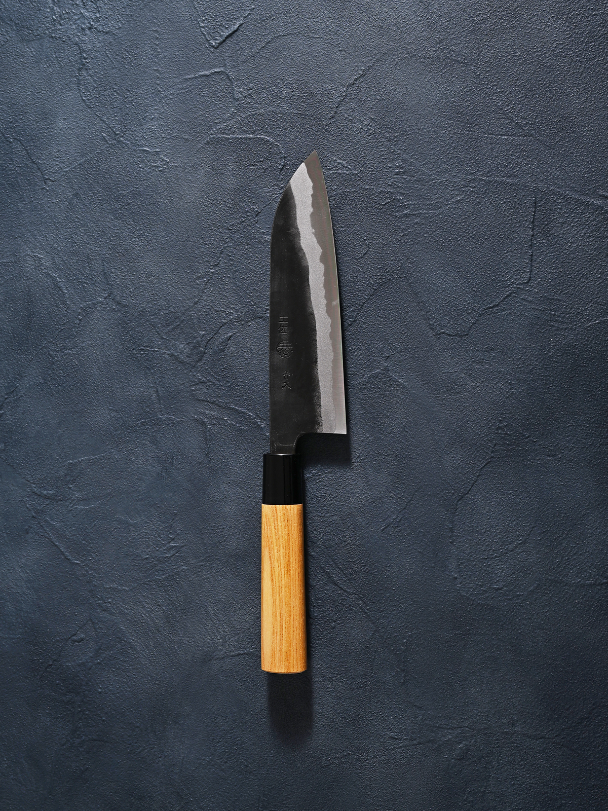 Kyohei Shindo Santoku Knife, Blue Steel No. 2, Black Finish, Keyaki Handle