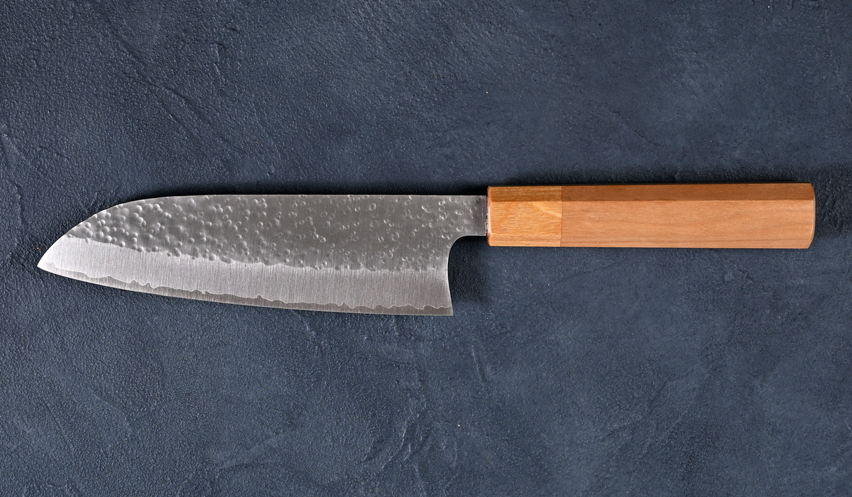 Makoto Kurosaki Sakura Hammered Santoku Knife, SG2 Powdered High-Speed Steel, Cherry Octagonal Handle