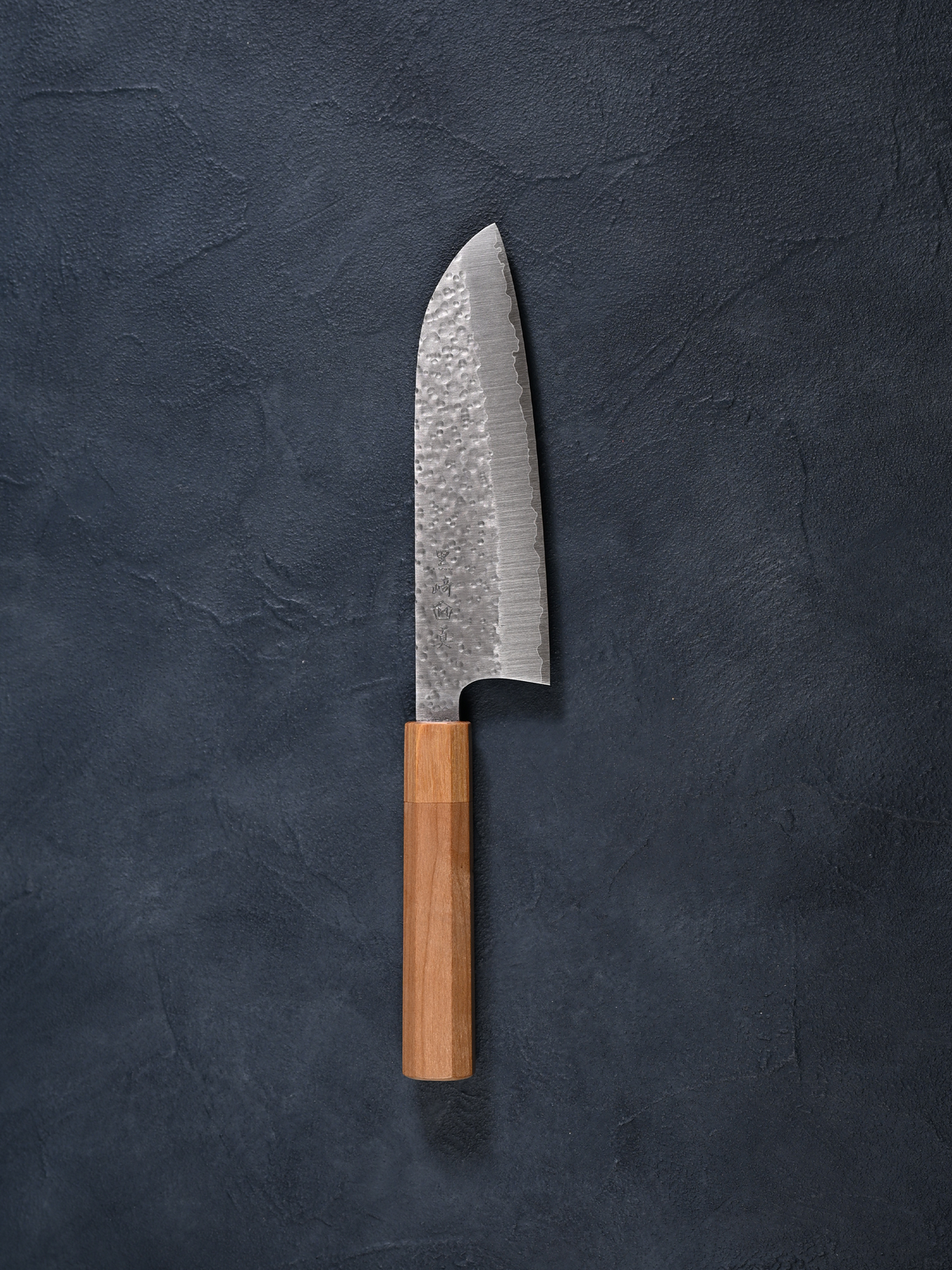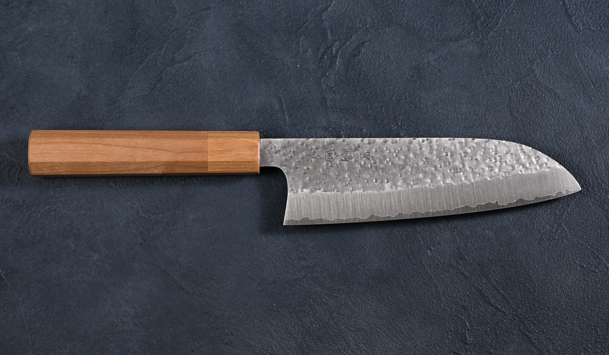 Makoto Kurosaki Sakura Hammered Santoku Knife, SG2 Powdered High-Speed Steel, Cherry Octagonal Handle (B-Grade with Scratches)
