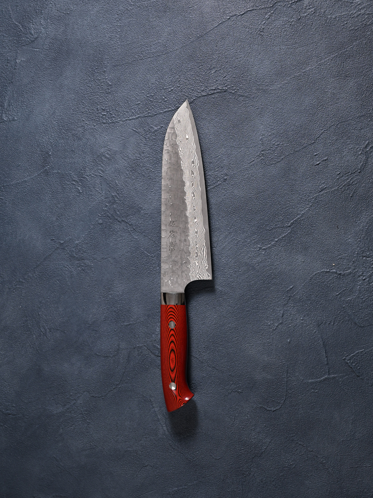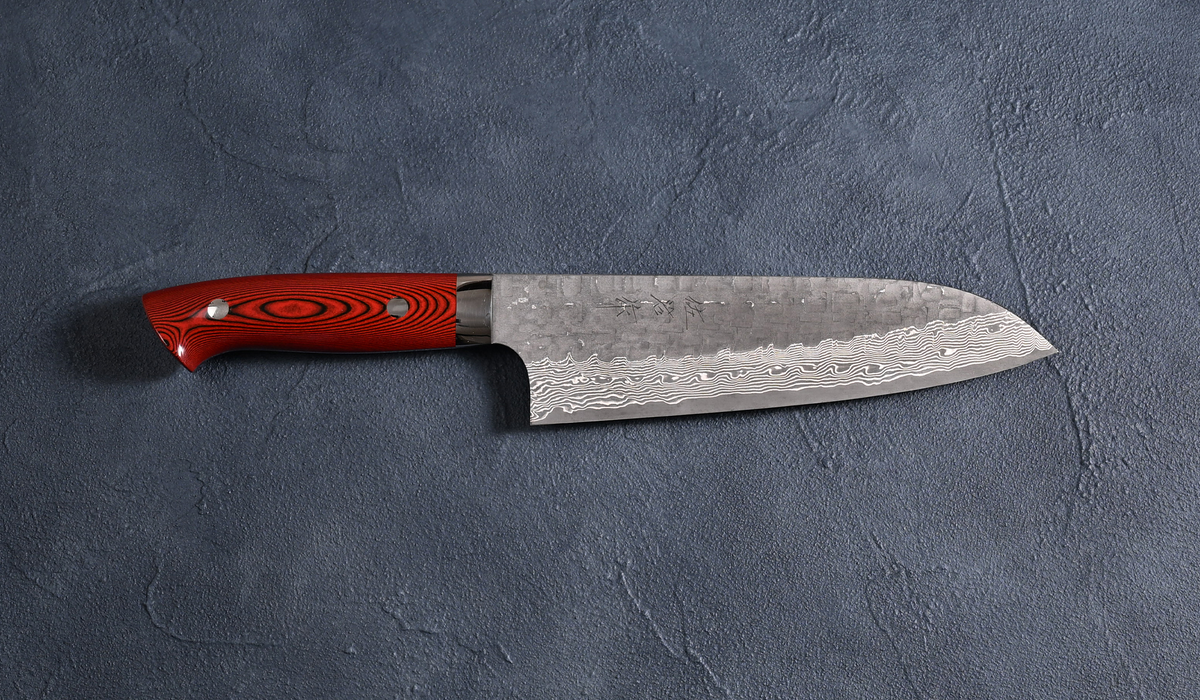Takeshi Saji Santoku Knife, VG10 Steel, Cross-Hammered Black Finish, Red and Black Micarta Handle
