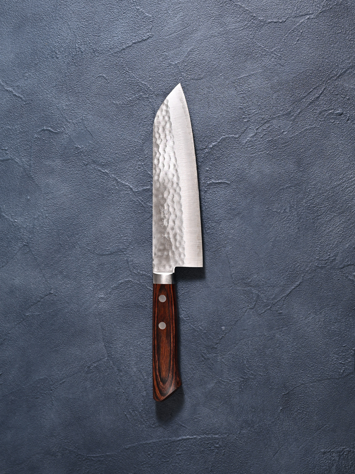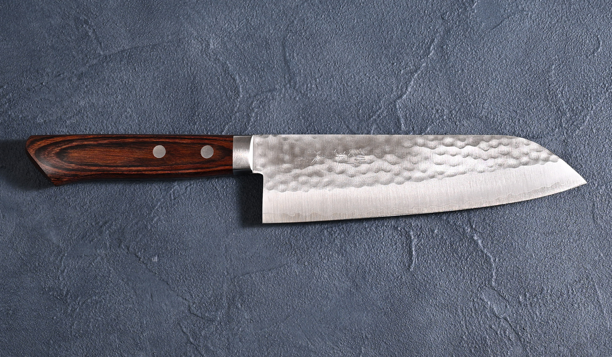 Masutanihamono Santoku knife, VG1 steel, hammered finish, brown, Western handle