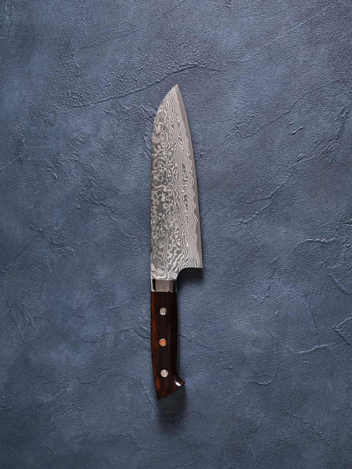 佐治武士 Takeshi Saji 三徳包丁 SG2粉末ハイス鋼 ダマスカス黒仕上 アイアンウッドハンドル