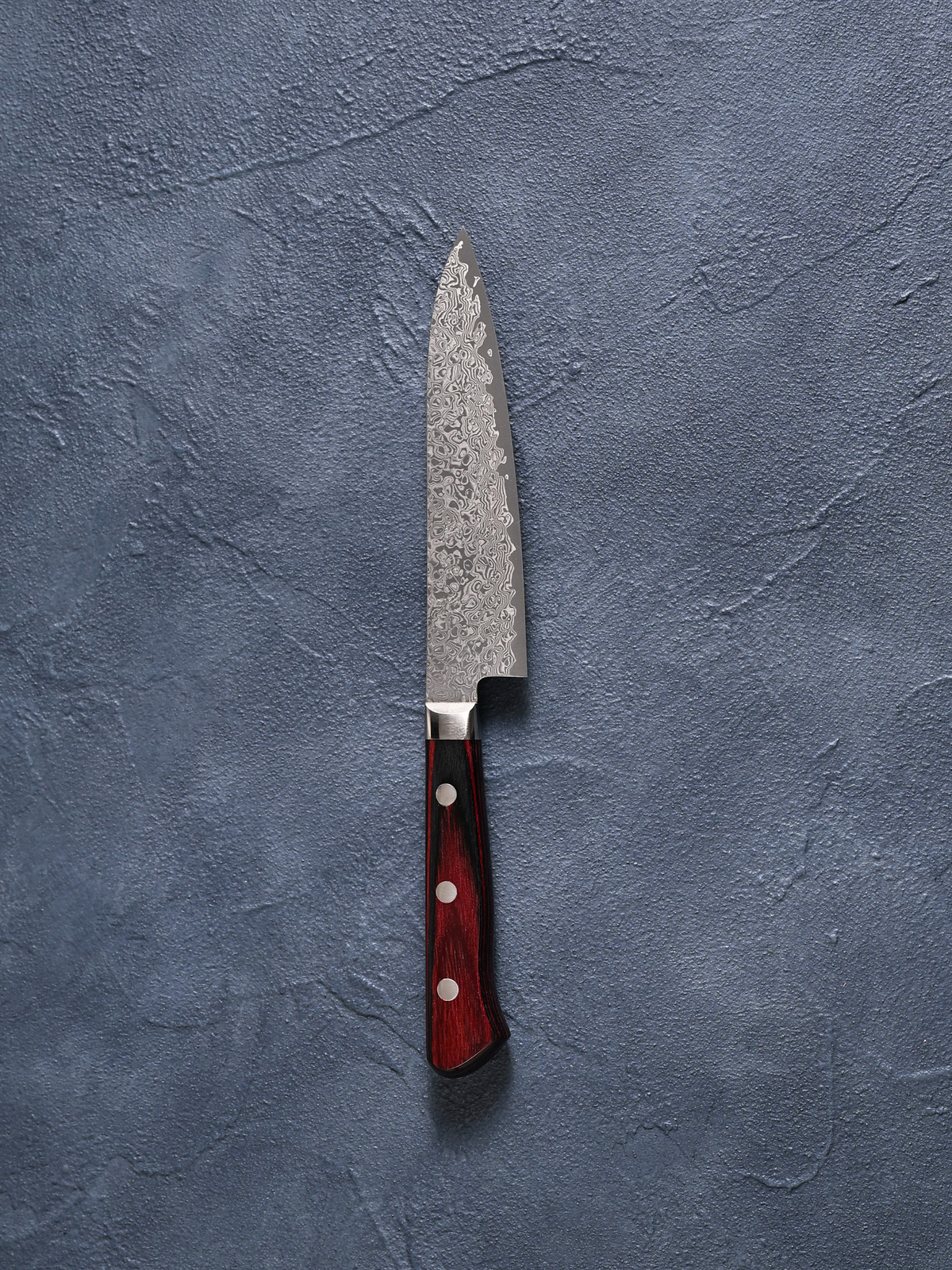 加藤義実 Yoshimi Kato ペティナイフ120mm VG10鋼 ダマスカス黒仕上げ 赤洋柄