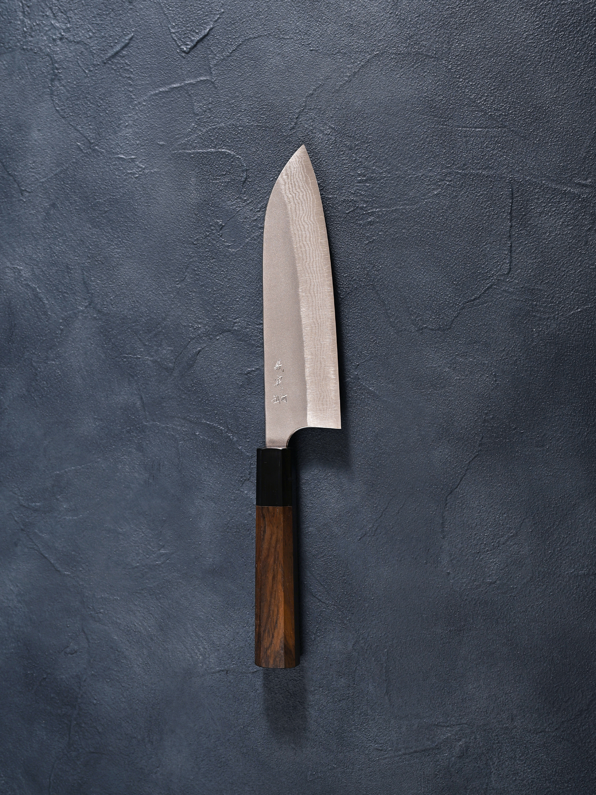 加藤義実 Yoshimi Kato 三徳包丁 VG10鋼 ダマスカス 梨地 水牛ウォルナット八角柄