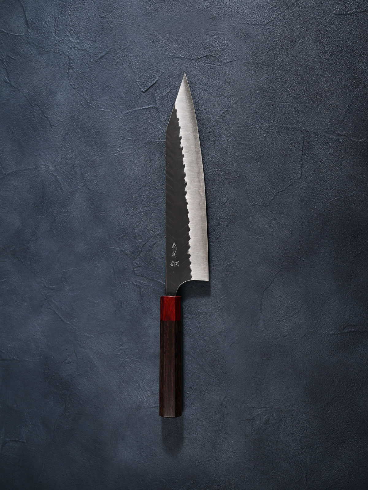 加藤義実 Yoshimi Kato 切付240mm 青紙スーパー鋼 黒打 V槌目 紫檀八角柄