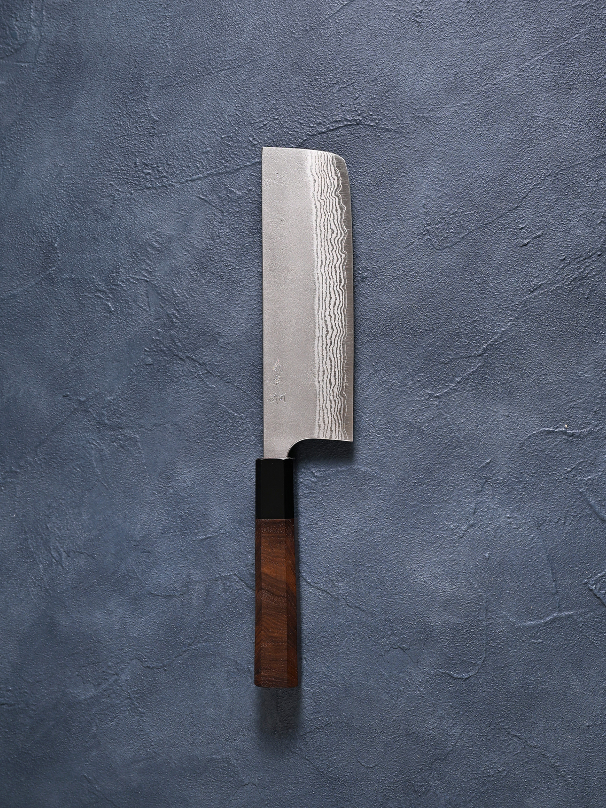 加藤義実 Yoshimi Kato 菜切包丁 VG10鋼 梨地 ダマスカス 水牛ウォールナット八角柄