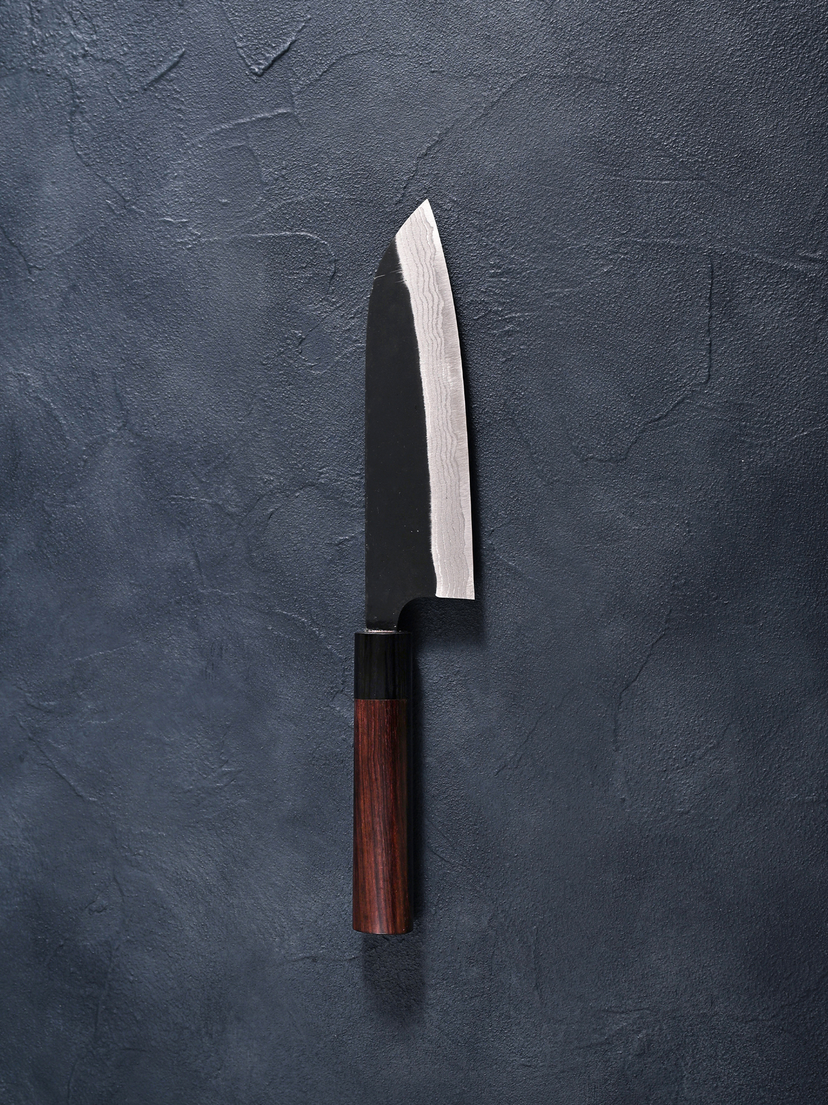 安立打刃物 Anryu 三徳包丁 白紙2号鋼 黒打 ダマスカス 紫檀丸柄