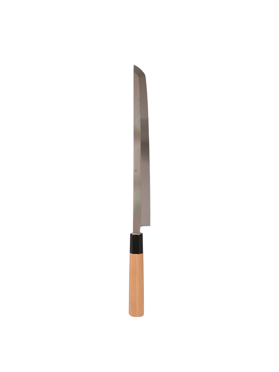 食材を引いて切る”削ぎ切り”に適している包丁です。お造りはもちろんたたきのスライスや ハム、ローストビーフなどの薄切りにも大変便利です。