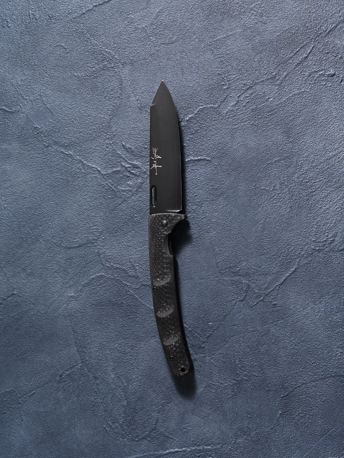 黒﨑優氏が手がけるフォールディングナイフ。黒色を基調とし青色でガラが施された目を引く1本です。キャンプなどアウトドアに最適です。