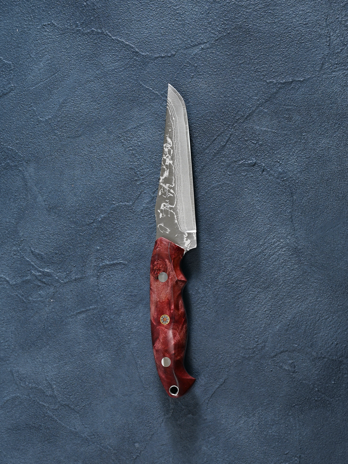 ダマスカス模様が美しい人気の鍛造ナイフです。美と機能性を兼ね備えた商品です。スタビライズドウッドのハンドルも幻想的で目を惹くデザインです。